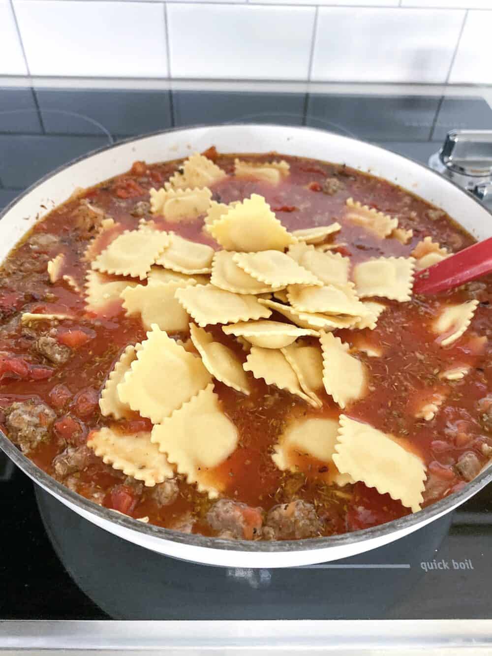Add Pasta To Soup. Add Ravioli, salt and pepper. Stir and let simmer for 10 minutes, or until ravioli is al dente. Reduce heat to low to prevent over cooking the pasta.